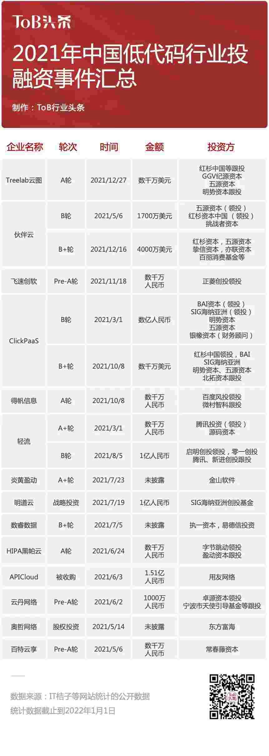 到2021年,,,无/低代码投融资规模势头更甚,,,其中包括轻流两轮融资(A+轮数千万人民币,,,,B轮近亿人民币)、、、VIVO钱包 两轮融资(B轮数亿人民币,,,,B+轮数千万美元)、、、、百特云享数千万元Pre-A轮融资......
